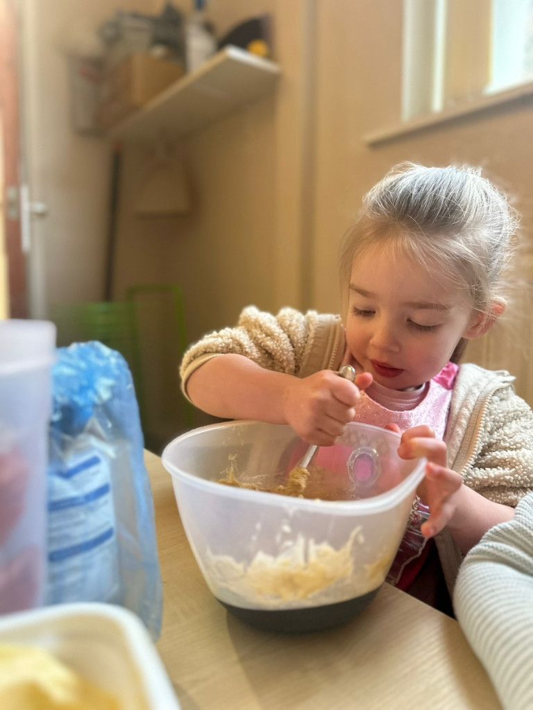 'Baking Orange Loaf Cake'. The children in the Smarties have had a full morning of baking, exploring weights and measurements, as they add the different materials to the bowl. Baking is a fantastic activity that is highly effective, hands on and educational. The children have been encouraged to develop their early numeracy skills, such as measuring and fractions, literacy, listening to instructions for the recipe and physical skills (Fine and gross motor skills/coordination) as they tip, pour and mix. Building on the children's early baking activity, Jess then supported a small group of children to make pink playdough, furthering developing their love of learning, through transitional, schematic play.